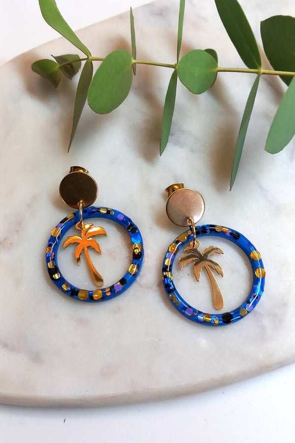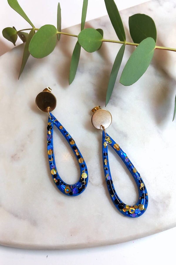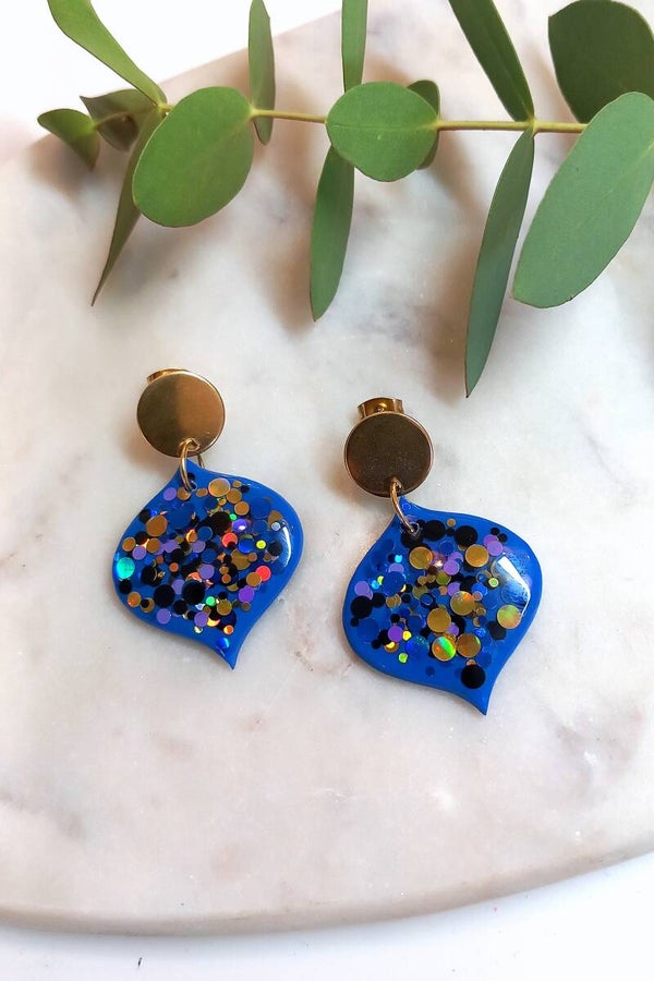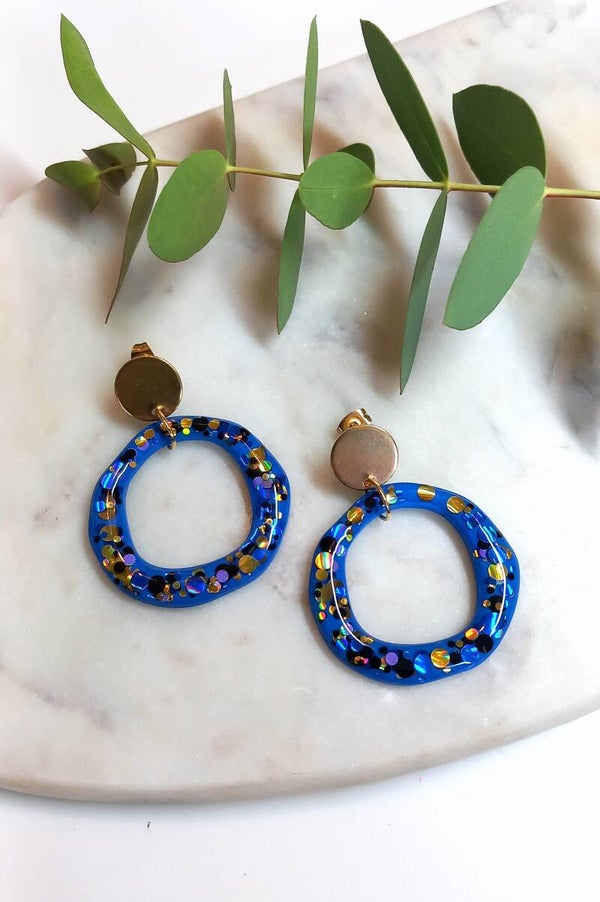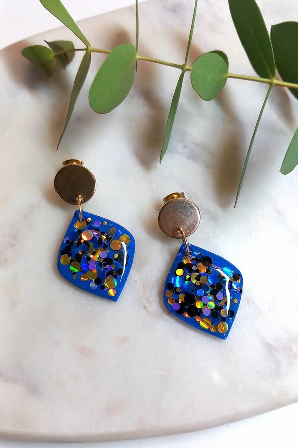 Deze oorbellen hebben glitters en zijn voorzien van een resin glanslaag.