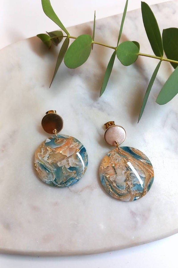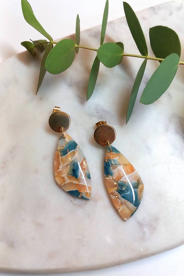 Deze oorbellen zijn voorzien van bladgoud en een resin glanslaag.