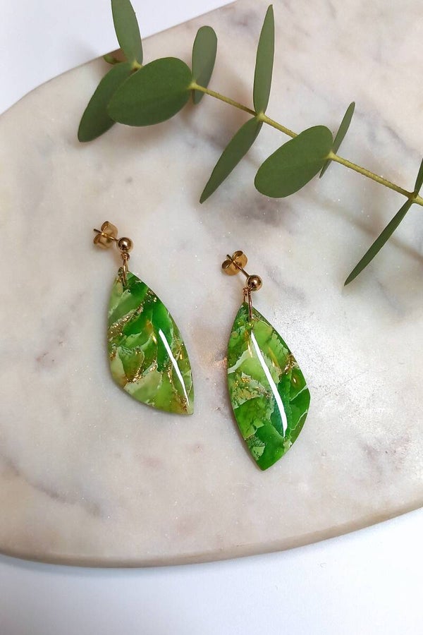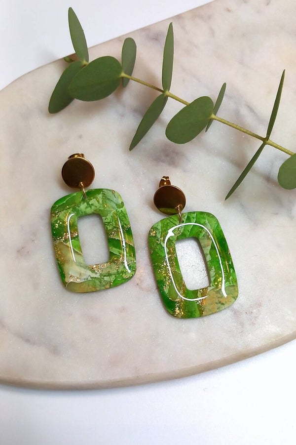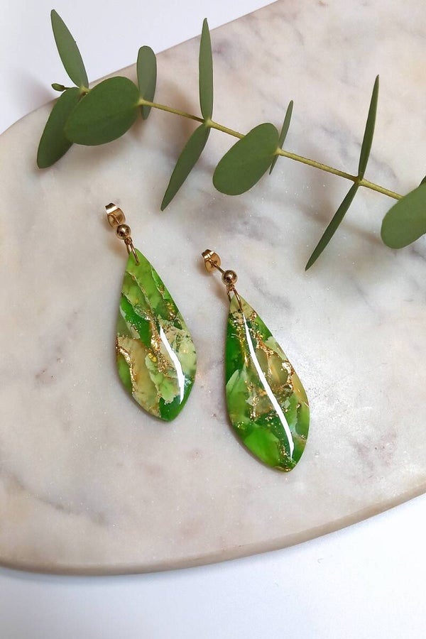 Deze oorbellen zijn voorzien van bladgoud en een resin glanslaag.