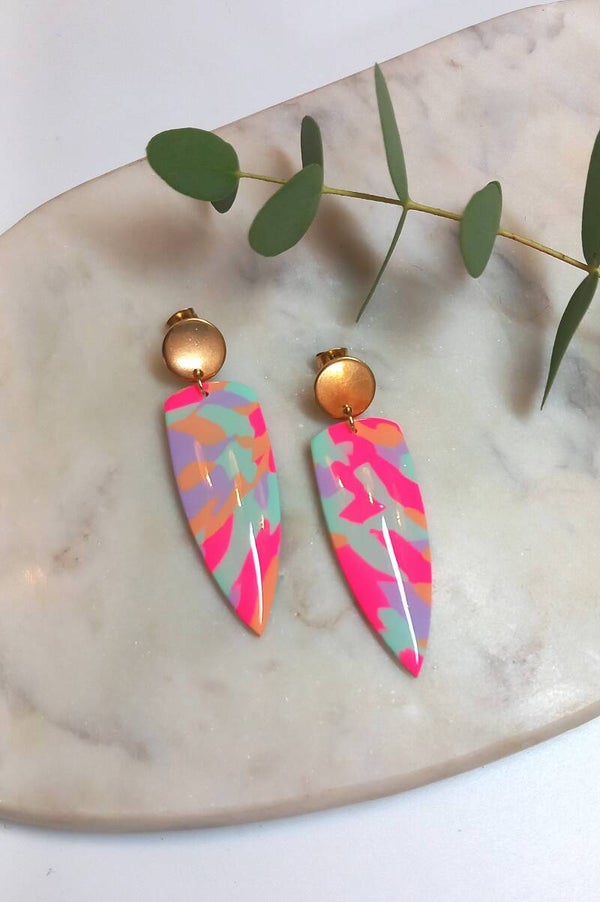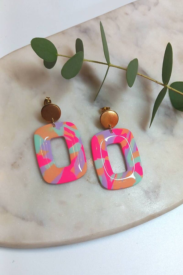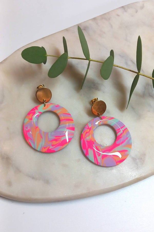 Deze oorbellen zijn voorzien van een resin glanslaag.
