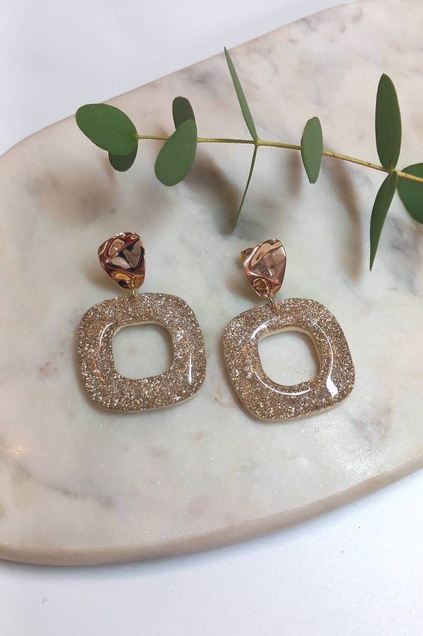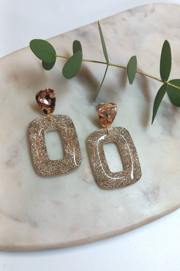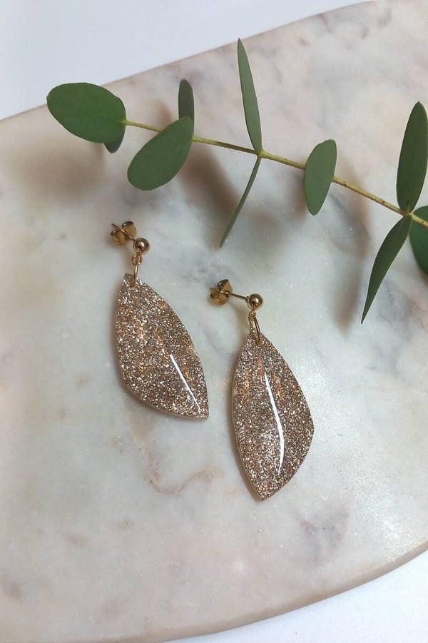 Deze oorbellen zijn voorzien van glitters en een resin glanslaag.