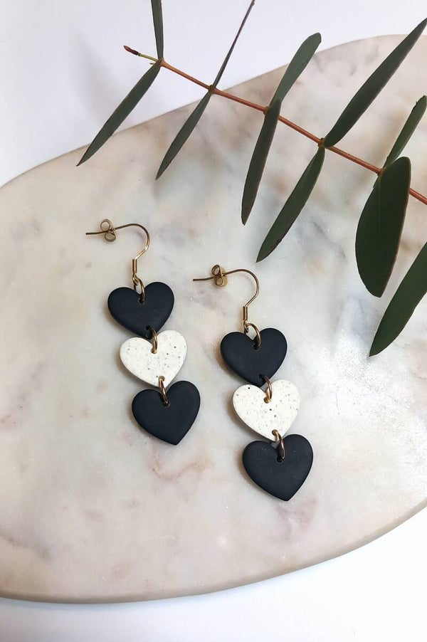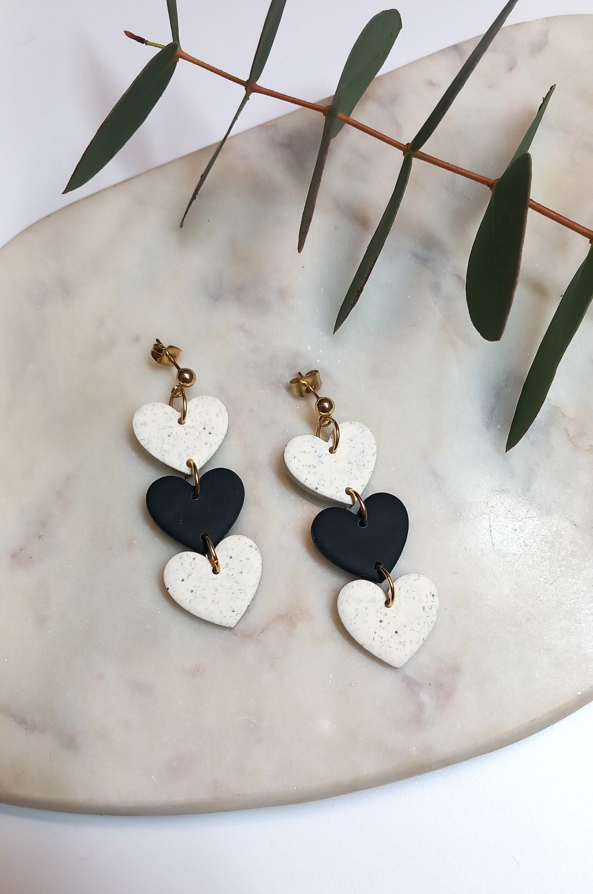 Deze oorbellen hebben hartjes in de kleur zwart en gebroken wit met spikkels.