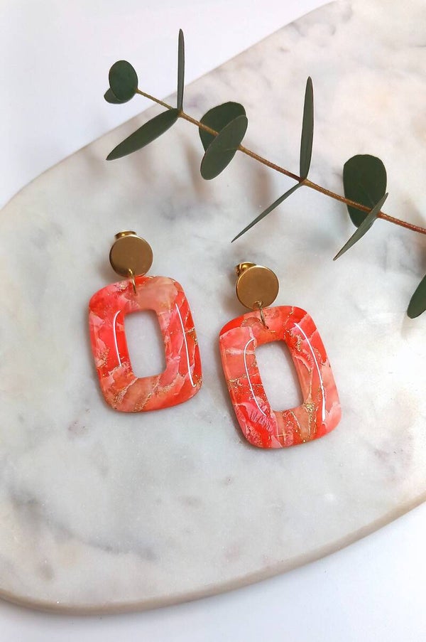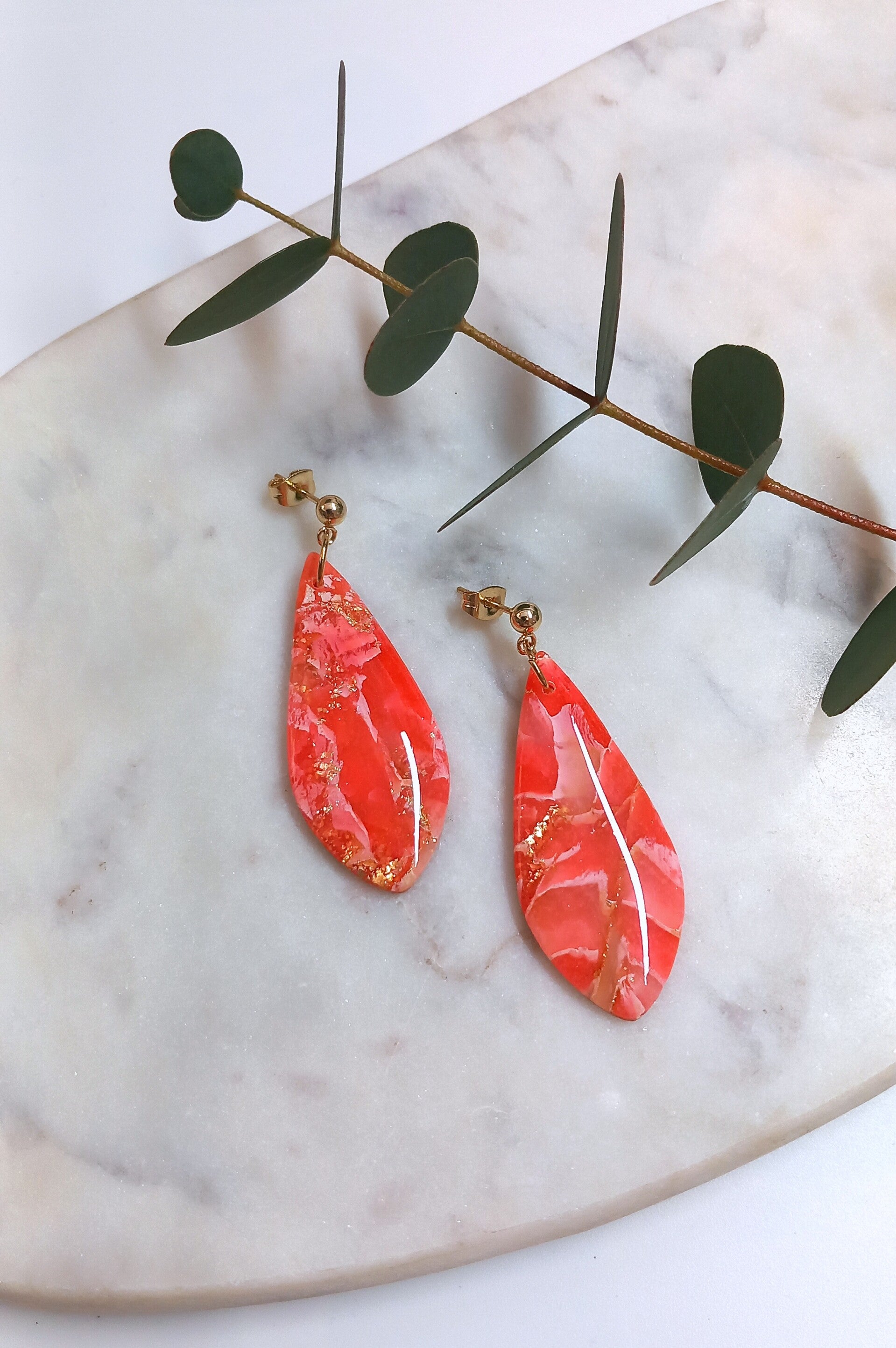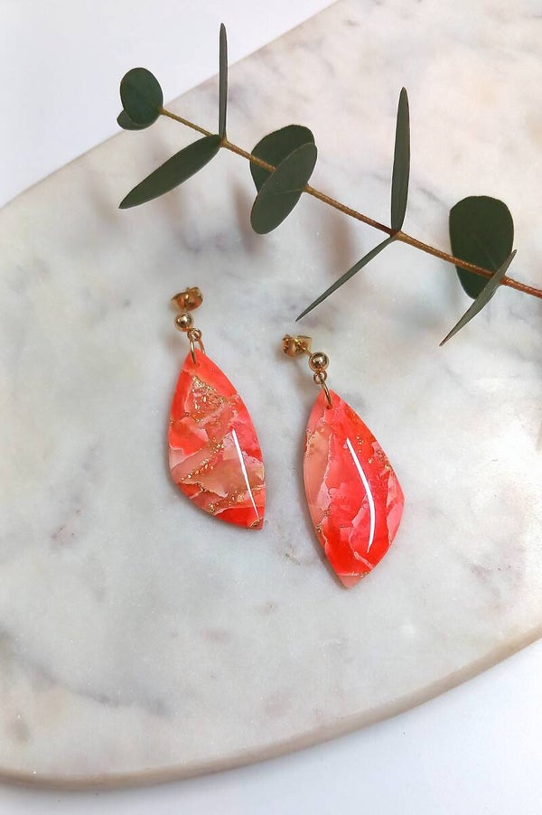 Deze oorbellen zijn voorzien van bladgoud en een resin glanslaag.