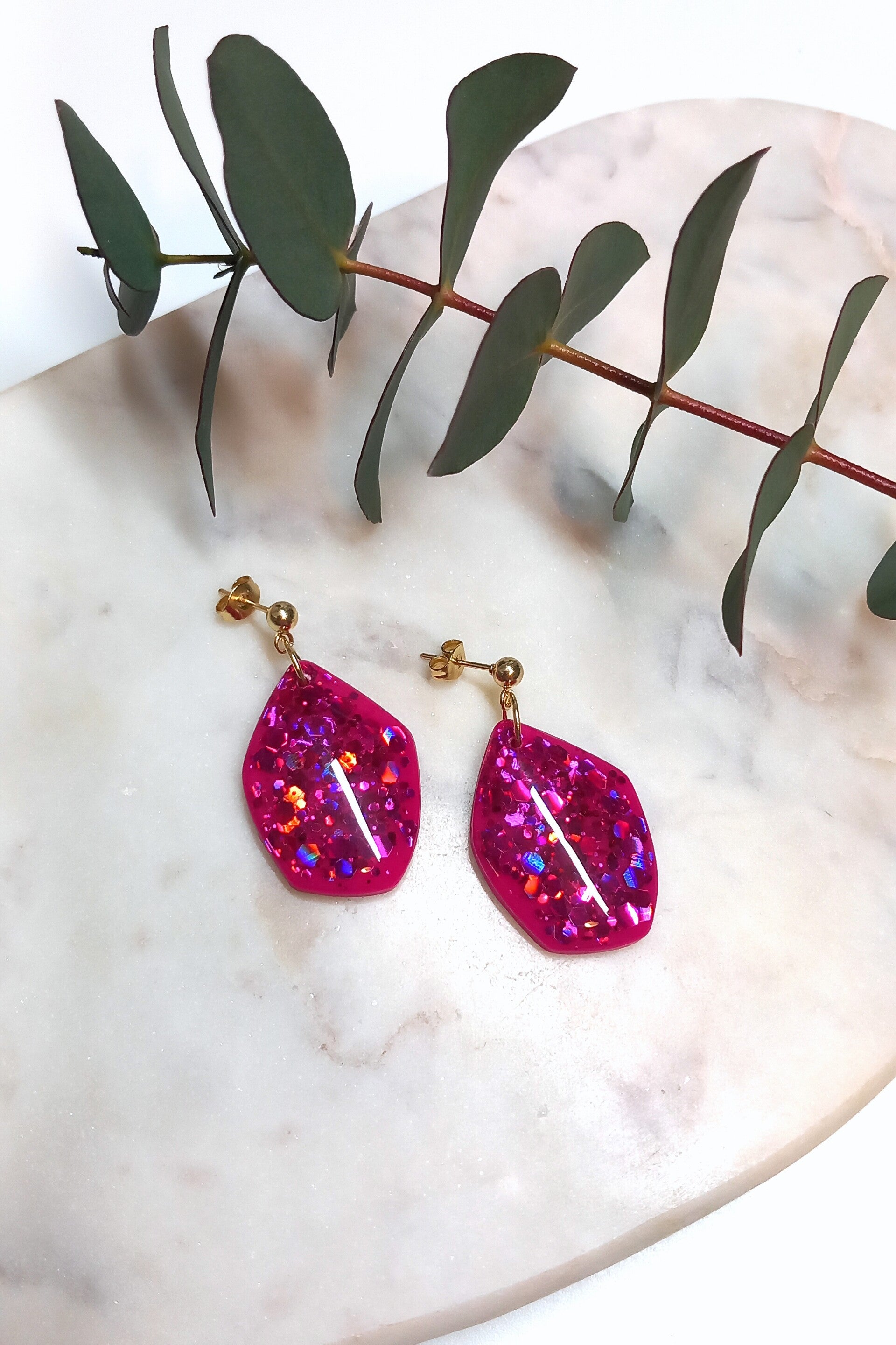 Deze oorbellen hebben glitters en zijn voorzien van een resin glanslaag.