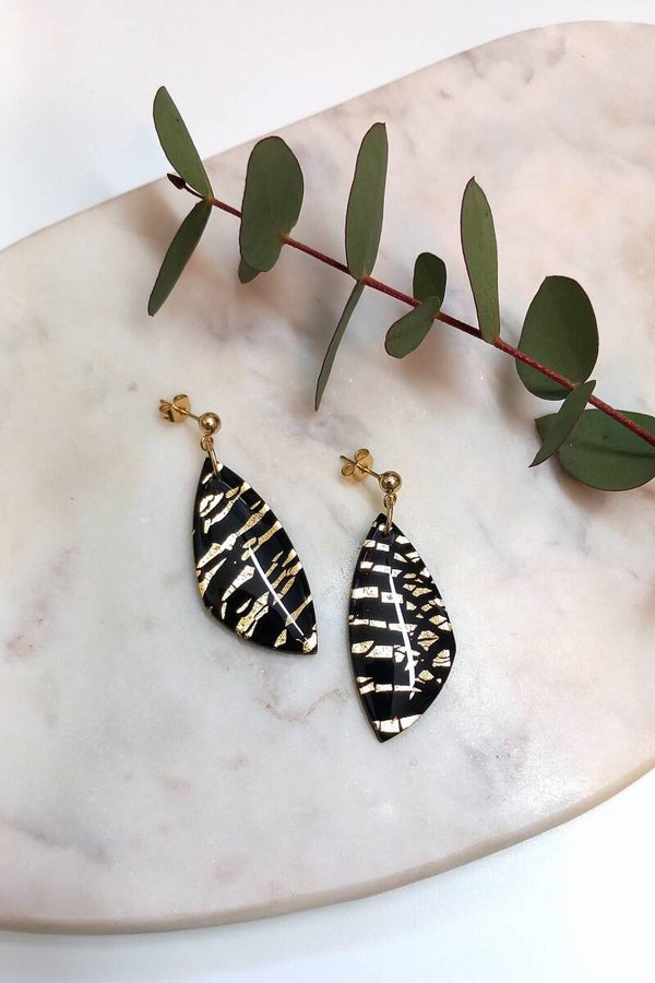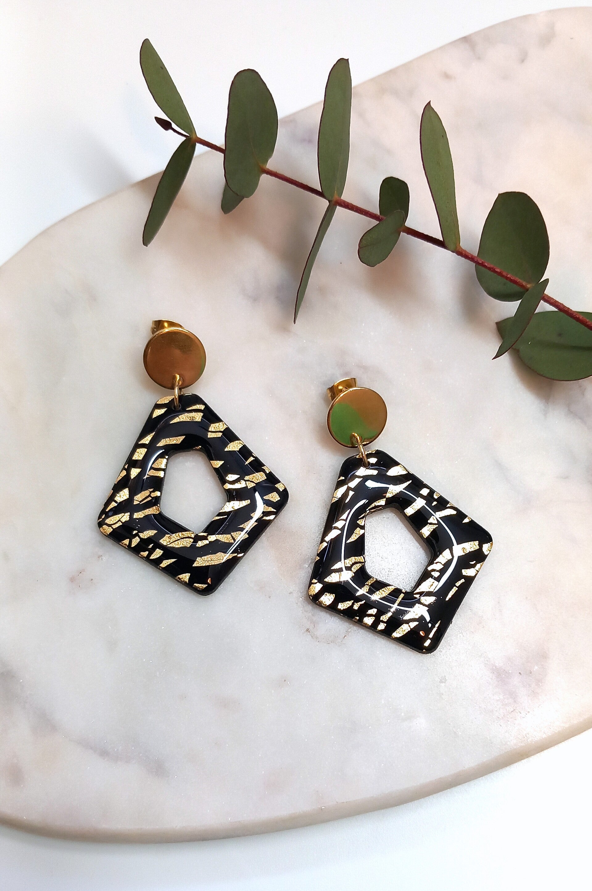 Deze oorbellen zijn voorzien van bladgoud en een resin glanslaag.